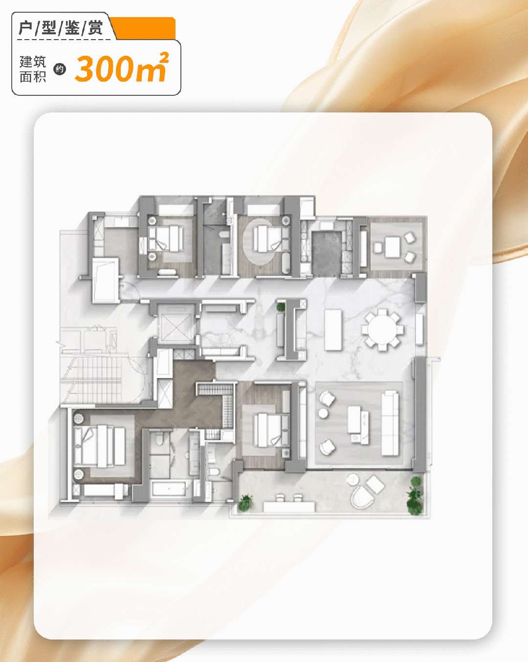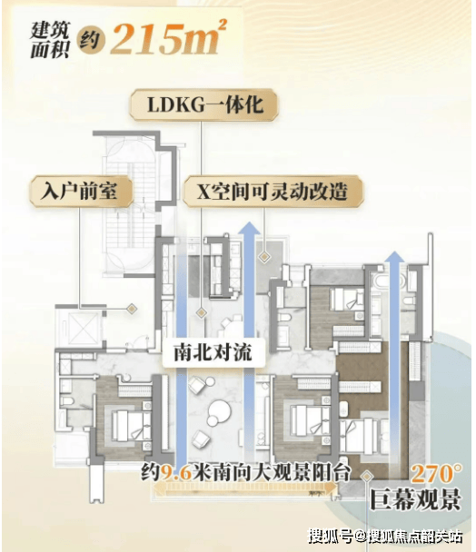 4. 约170㎡四房两厅三卫(悦嘉D-2户型):该户型为高端改善户型,全明通透设计,南北通透对流,四开间朝南,纵向空间舒适。客厅采用半开放式中西厨设计,LDKG一体化布局,从容有序,方便家人互动与社交;公共空间面积宽敞,涵盖客厅、书房、南北双阳台与餐厨区域,实用性与舒适性兼具;主卧为天空之境套房,面积约28㎡,无界视野沉浸式观景,配备独立卫生间、衣帽间及大飘窗,私密性与舒适度拉满;三个卧室均可以直望中心园林,配备大面宽飘窗,将窗外绿意引入室内;X空间灵动改造,可根据家庭需求灵活调整为书房、儿童房、健身房等,与家庭一同成长;此外,户型设计有80cm飘窗,可砸除约50cm,增加地面使用空间,实用性更强,适合高端改善家庭或多代共居家庭。